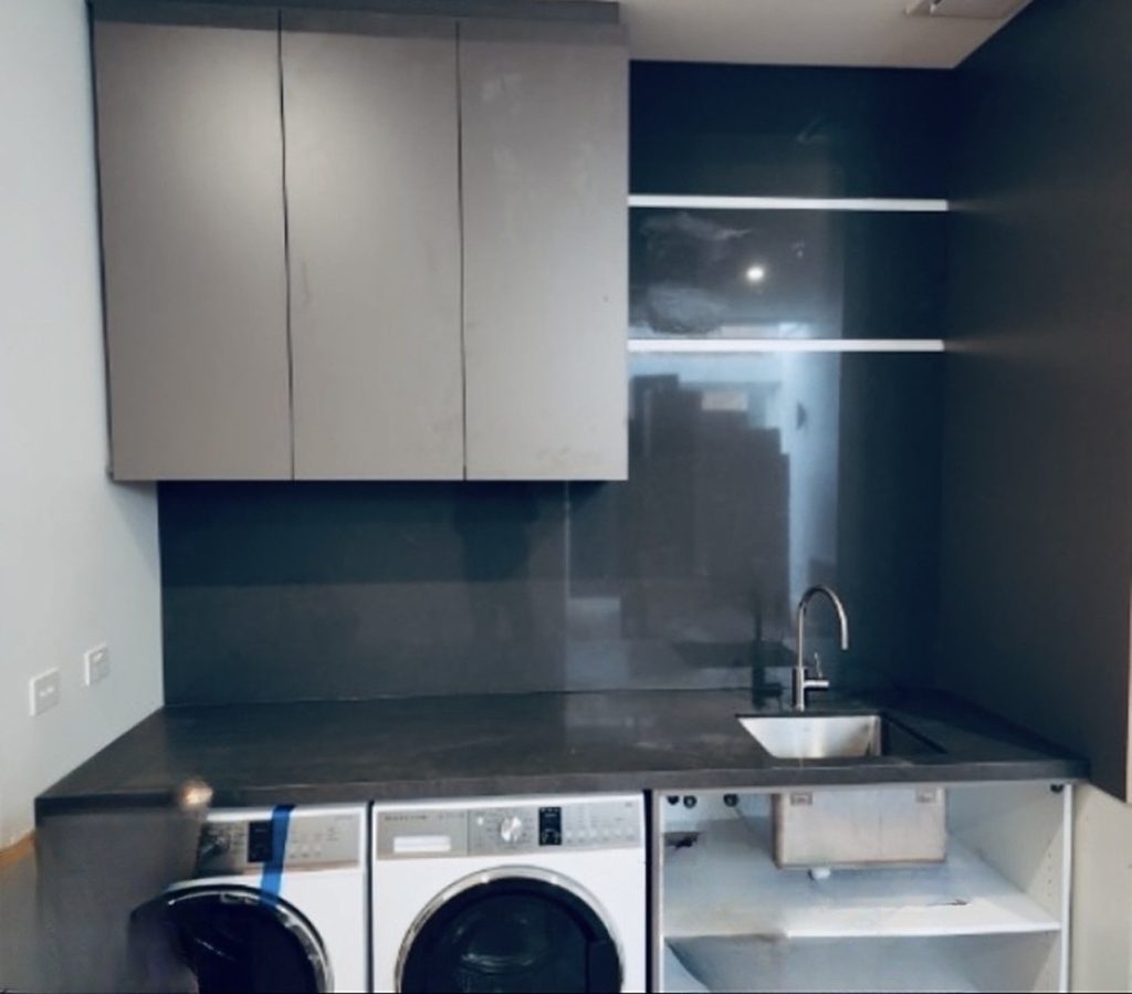 Stone benchtops are widely used in laundries because they endure moisture better than many materials. Natural and reconstituted stone are good choices for surfaces that may remain damp or exposed to splashing. -